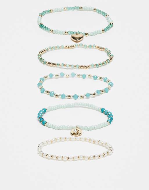 ASOS DESIGN - Set van armbanden met blauwe kraaltjes en imitatieparels in goudkleur