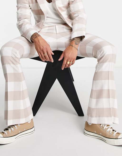 ASOS DESIGN - Skinny geruite pantalon met uitlopende pijpen in beige buffalo