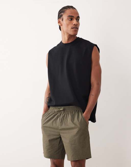 ASOS DESIGN - Smalle halflange elastische short van seersuckerstof in kaki