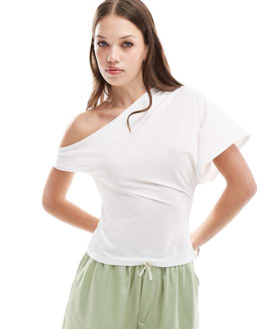 ASOS DESIGN - Soepelvallende top van gladde stof met blote schouder en uitlopende mouw in ivoorwit