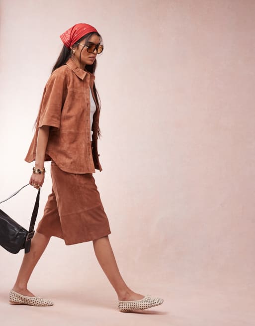 ASOS DESIGN - Suède co-ord set met overhemd en short in lichtbruin