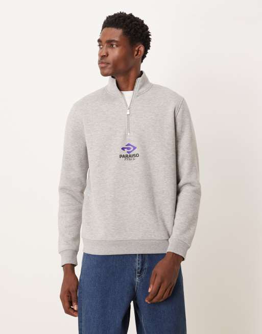 ASOS DESIGN - Sweatshirt met korte rits en borduursl in gemêleerd grijs