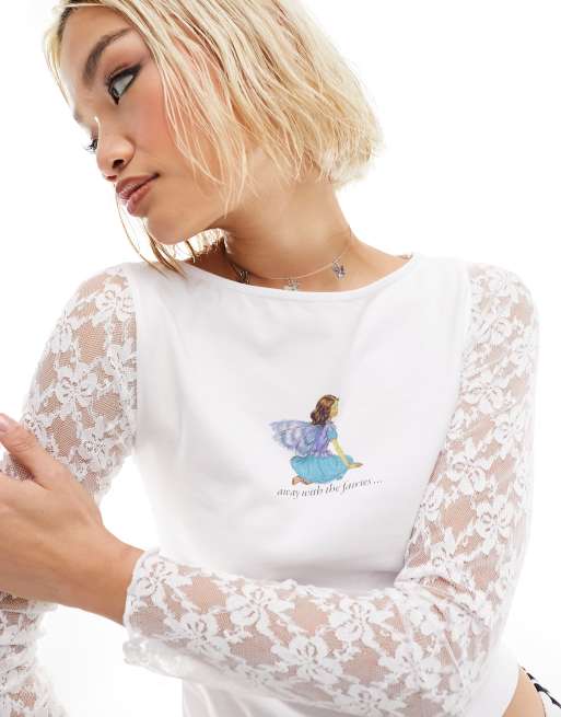 ASOS DESIGN - T-shirt met 'Away with the fairies' print met kanten mouwen in ivoor