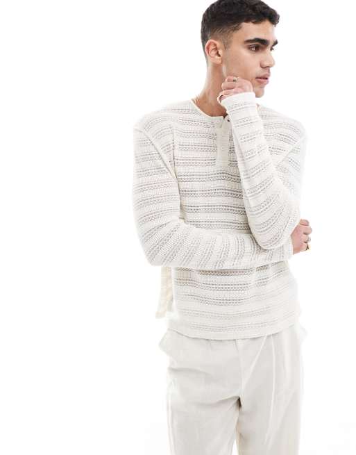 ASOS DESIGN - T-shirt met lange mouwen en Henley-hals in beige met textuur