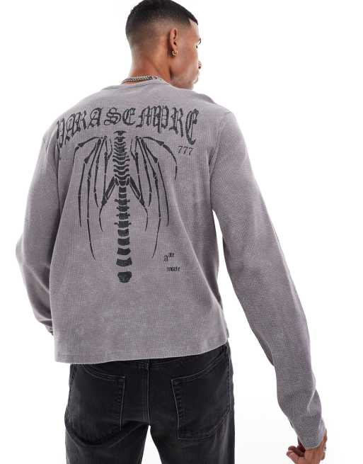 ASOS DESIGN - T-shirt met lange mouwen en Henley-hals in grijs met grunge-print op de achterkant
