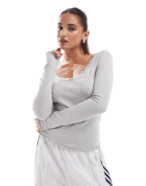 ASOS DESIGN - T-shirt met lange mouwen en lage ronde hals met kant in grijs
