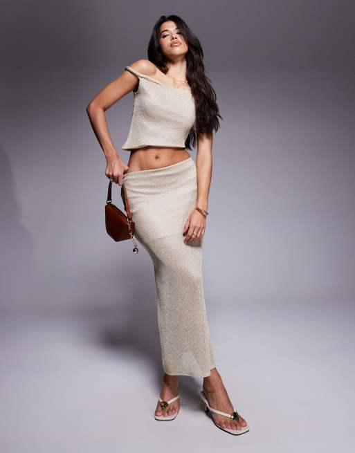 ASOS DESIGN - Top met gedraaide blote schouder en maxirok met glitterbreisel, co-ord set