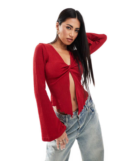 ASOS DESIGN - Top met gedraaide voorkante en lange uitlopende mouwen in rood