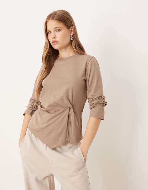 ASOS DESIGN - Top met geknoopt detail en lange mouwen in mokka