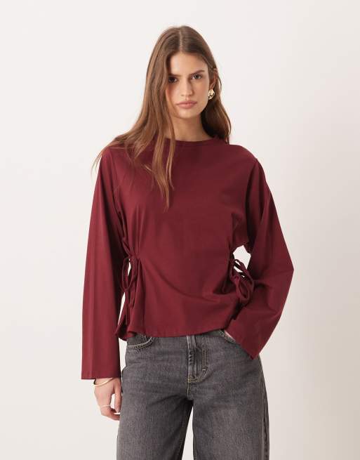 ASOS DESIGN - Top met gestrikte taille en lange mouwen in donker kersenrood