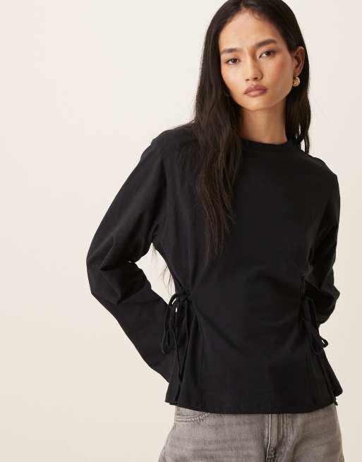 ASOS DESIGN - Top met gestrikte taille en lange mouwen in zwart