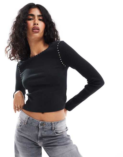 ASOS DESIGN - Top met lange mouwen en studs in zwart