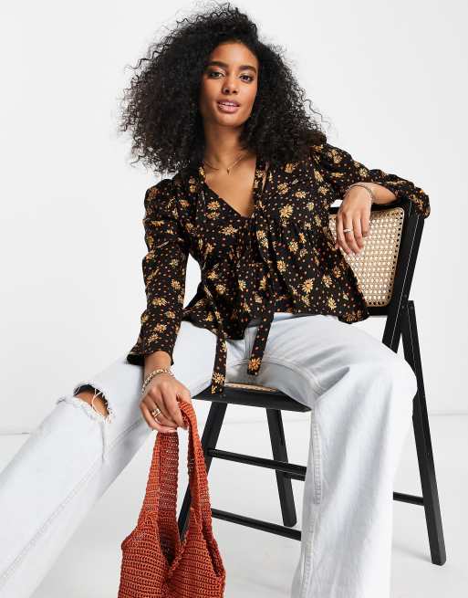 ASOS DESIGN - Top met lange mouwen, V-hals, gestrikte hals en peplumzoom in oranje bloemenprint