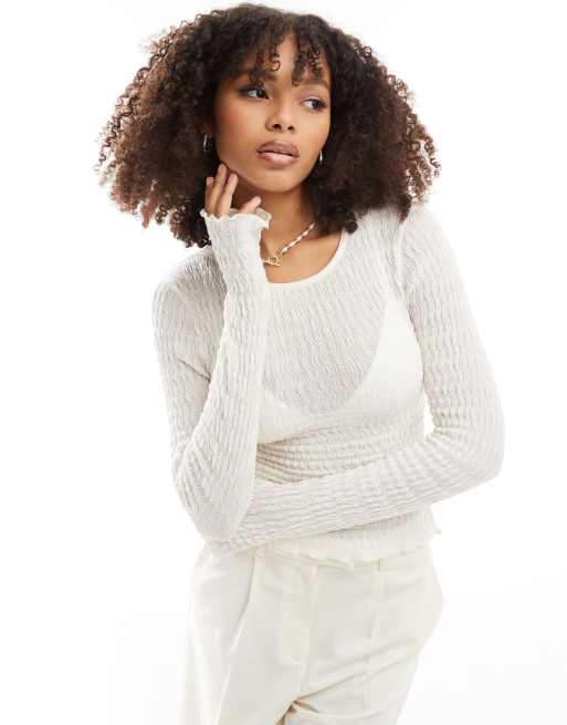 ASOS DESIGN - Top met textuur, lange mouwen en geschulpte zoom in wit