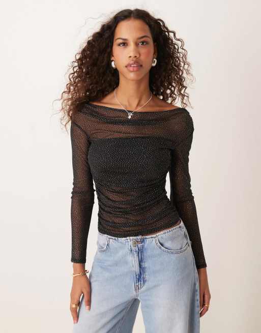 ASOS DESIGN - Top van gerimpeld glittermesh met blote schouders in zwart