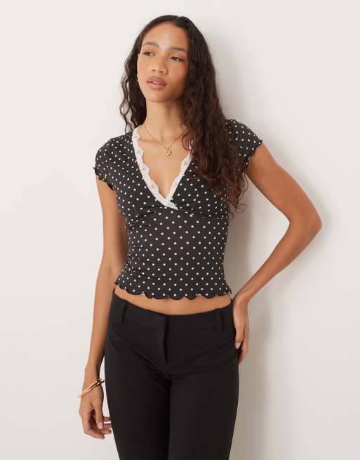 ASOS DESIGN - Top van gladde stof met V-hals, polkadots en kanten rand in zwart en wit