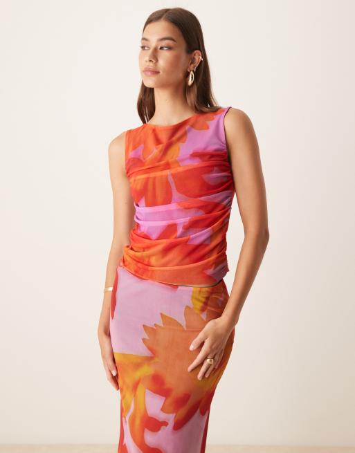 ASOS DESIGN - Top van mesh met oversized tropische print in oranje, deel van co-ord set