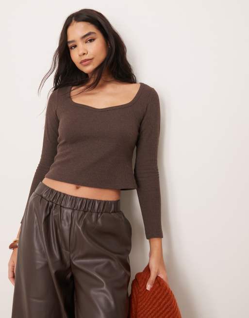 ASOS DESIGN - Top van wafelstof met hartvormige halslijn in bruin