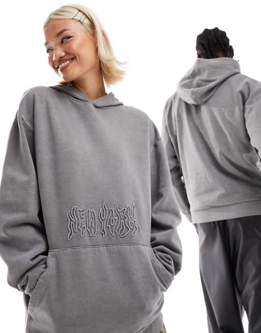 ASOS DESIGN - Uniseks oversized hoodie met New York-borduursel in grijs met wassing