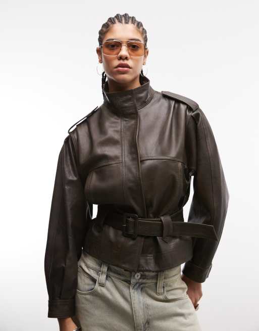 ASOS DESIGN - Utility jack van echt leer met riem in bruin met wassing