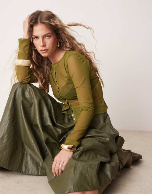 ASOS DESIGN - Vest van mesh met parelmoer knopen in olijfgroen