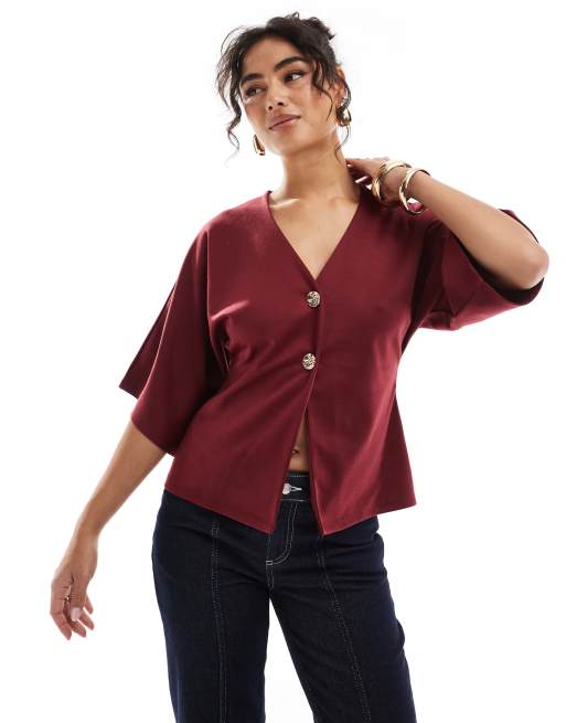 ASOS DESIGN - Vest van pontestof met korte mouwen en gouden knopen in bordeauxrood