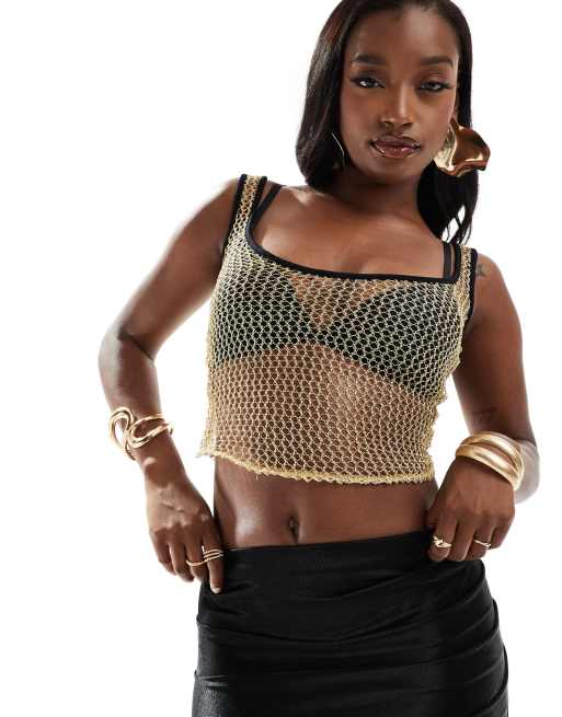 ASOS DESIGN - Visnettop met glitter en biezen in goud