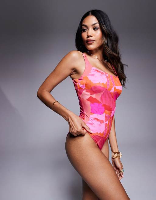 ASOS DESIGN - Vollere buste - Exclusives - Arina - Ultimate Revenge - Corrigerend badpak met vierkante hals en abstracte print in roze en rood