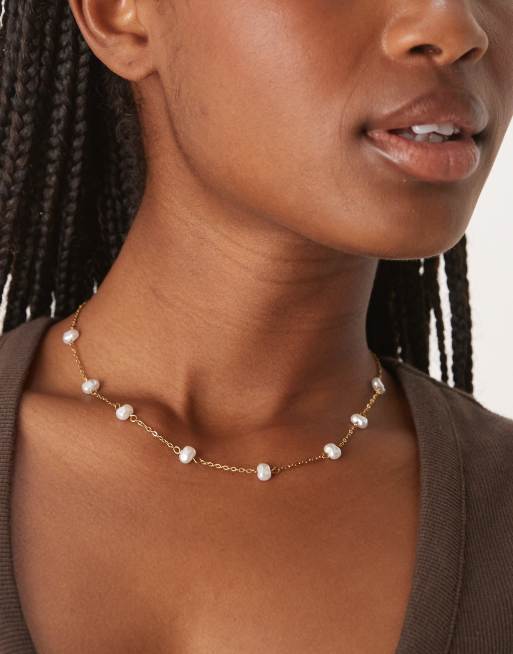ASOS DESIGN - Waterdichte roestvrijstalen ketting met parel stippel-streep ketting in goudkleur