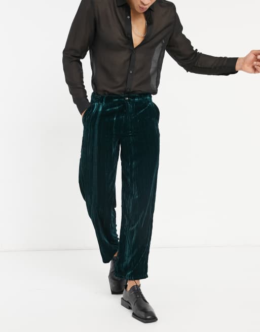 ASOS DESIGN - Wijde broek van gekreukt fluweel in diepgroen