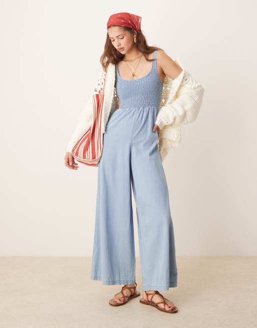 ASOS DESIGN - Zachte denim jumpsuit met wijde pijpen, gesmokt lijfje en lichte wassing