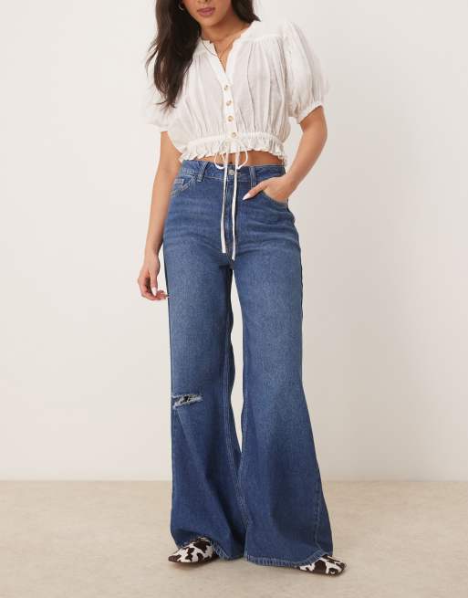 ASOS DESIGN - Zachte jeans met wijde pijpen en scheuren in fel middenblauw