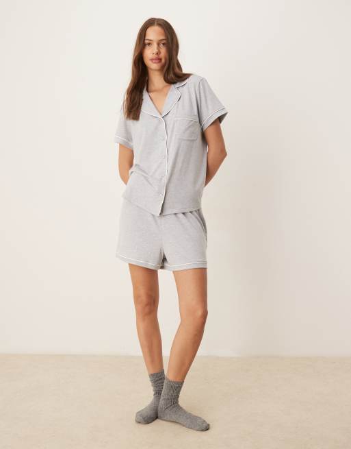 ASOS DESIGN - Zachte pyjamaset van overhemd met korte mouwen en short in grijs met contrasterende biezen