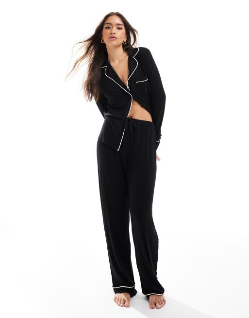 ASOS DESIGN - Zachte pyjamaset van overhemd met lange mouwen en broek in zwart met contrasterende biezen