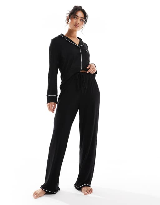 ASOS DESIGN - Zachte pyjamaset van overhemd met lange mouwen en broek in zwart met contrasterende biezen