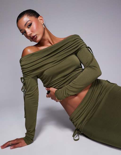 ASOS DESIGN - Zachte top met blote schouders, rimpeleffect en lange mouwen in olijfgroen