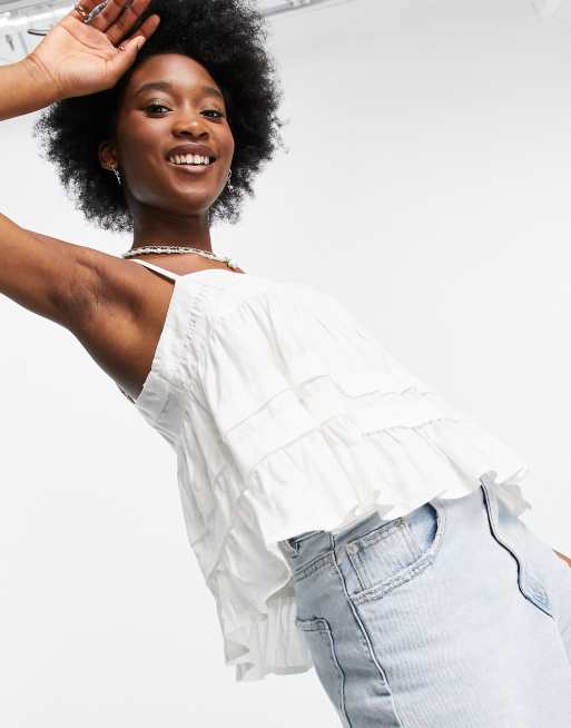 ASOS DESIGN - Zonnetop met vierkante hals, plat gestikte plooitjes en ruches langs zoom in ivoor