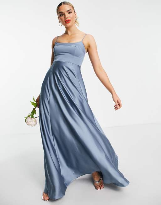 ASOS EDITION - Lange satijnen cami-jurk met vierkante hals in vaalblauw