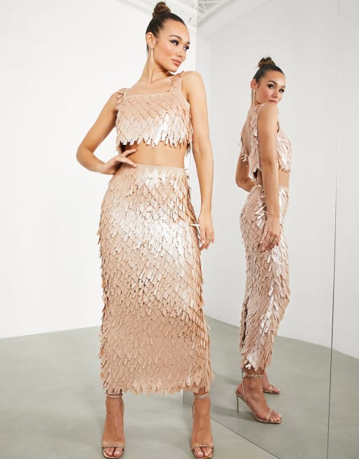 ASOS EDITION - 3-delige combi-set van crop top, sweater en rok met traanvormige lovertjes in beigeroze