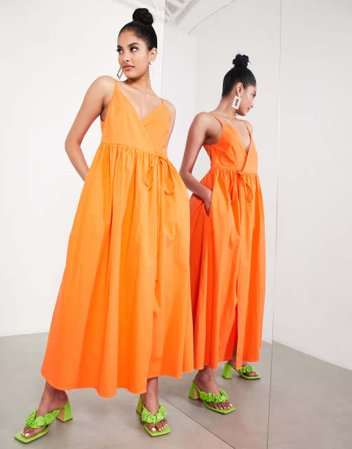 ASOS EDITION - Aangerimpelde midi zonnejurk met overslag en camibandjes in feloranje