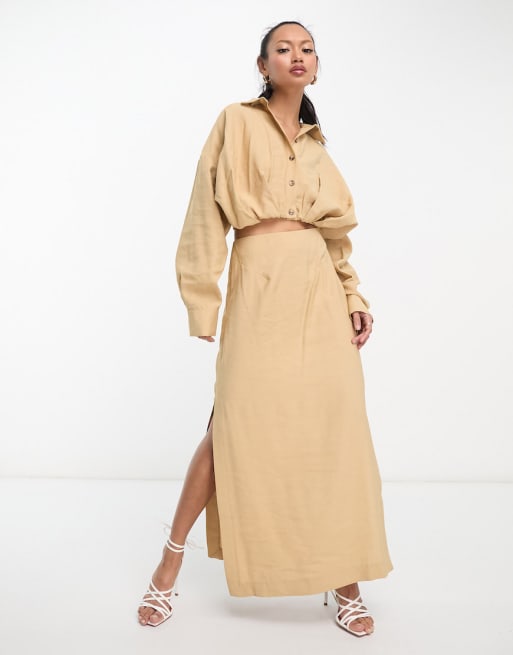 ASOS EDITION - Cropped overhemd met vleermuismouwen en midi rok in camel