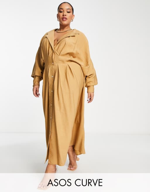 ASOS EDITION Curve - Gedrapeerde midi overhemdjurk met geplooide taille in camel