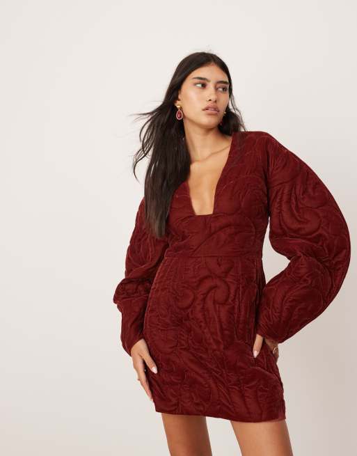 ASOS EDITION - Geborduurde gewatteerde mini jurk van fluweel met mouwdetails in bordeauxrood