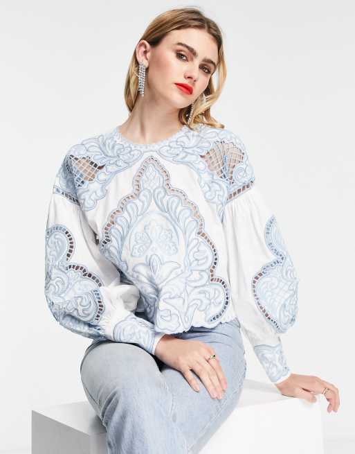 ASOS EDITION - Geborduurde katoenen top met pofmouwen in blauw