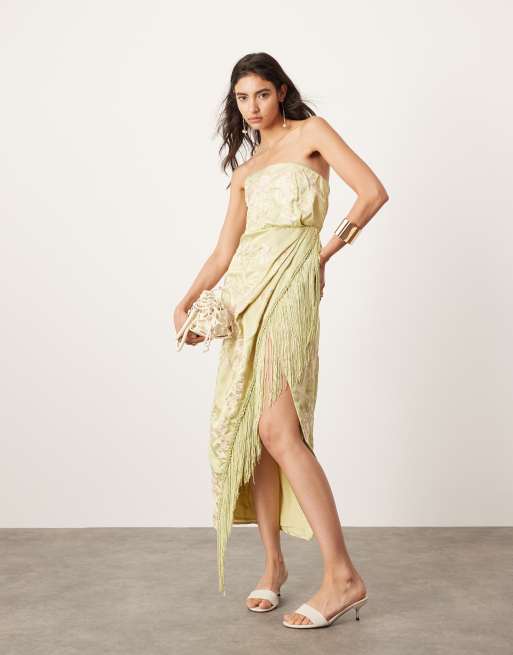 ASOS EDITION - Gedrapeerde midi bandeau-jurk met borduursels en franjes in olijfgroen