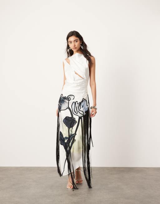 ASOS EDITION - Gedrapeerde midi jurk met gedrapeerde achterkant, geborduurde bloemen en franjes in crème
