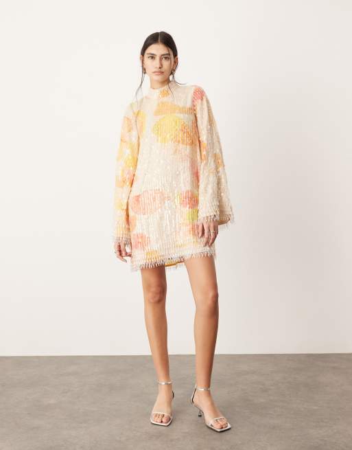ASOS EDITION - Hoogsluitende mini jurk met print, lovertjes, franje en bloemenprint in oranje