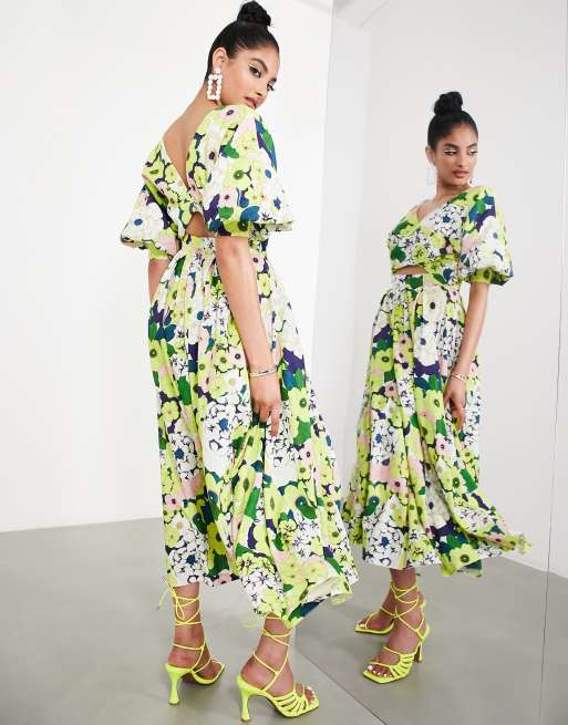 ASOS EDITION - Linnen midi jurk met overslag aan de voorkant en blousonmouwen in bloemenprint