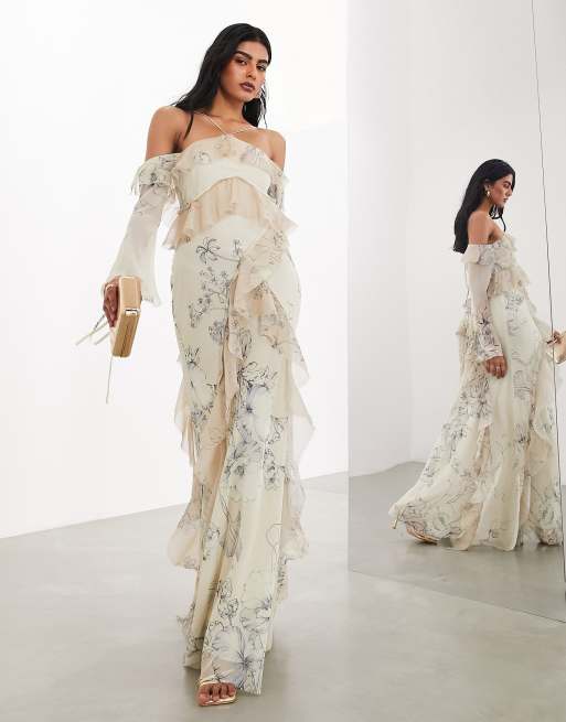 ASOS EDITION - Maxi halterjurk met blote schouders, onafgewerkte randen, ruches en geëtste bloemenprint