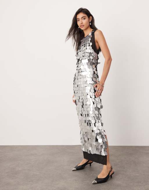 ASOS EDITION - Midaxi jurk met onafgewerkte rand en onregelmatige lovertjes en open achterkant in zilver